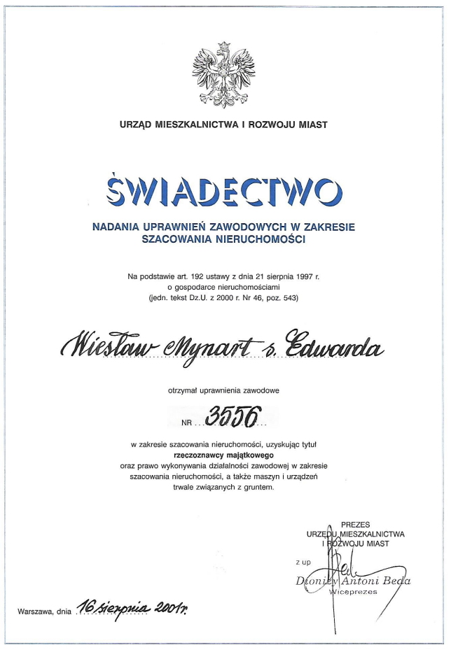 – uprawnienia zawodowe w zakresie szacowania nieruchomości nr 3556